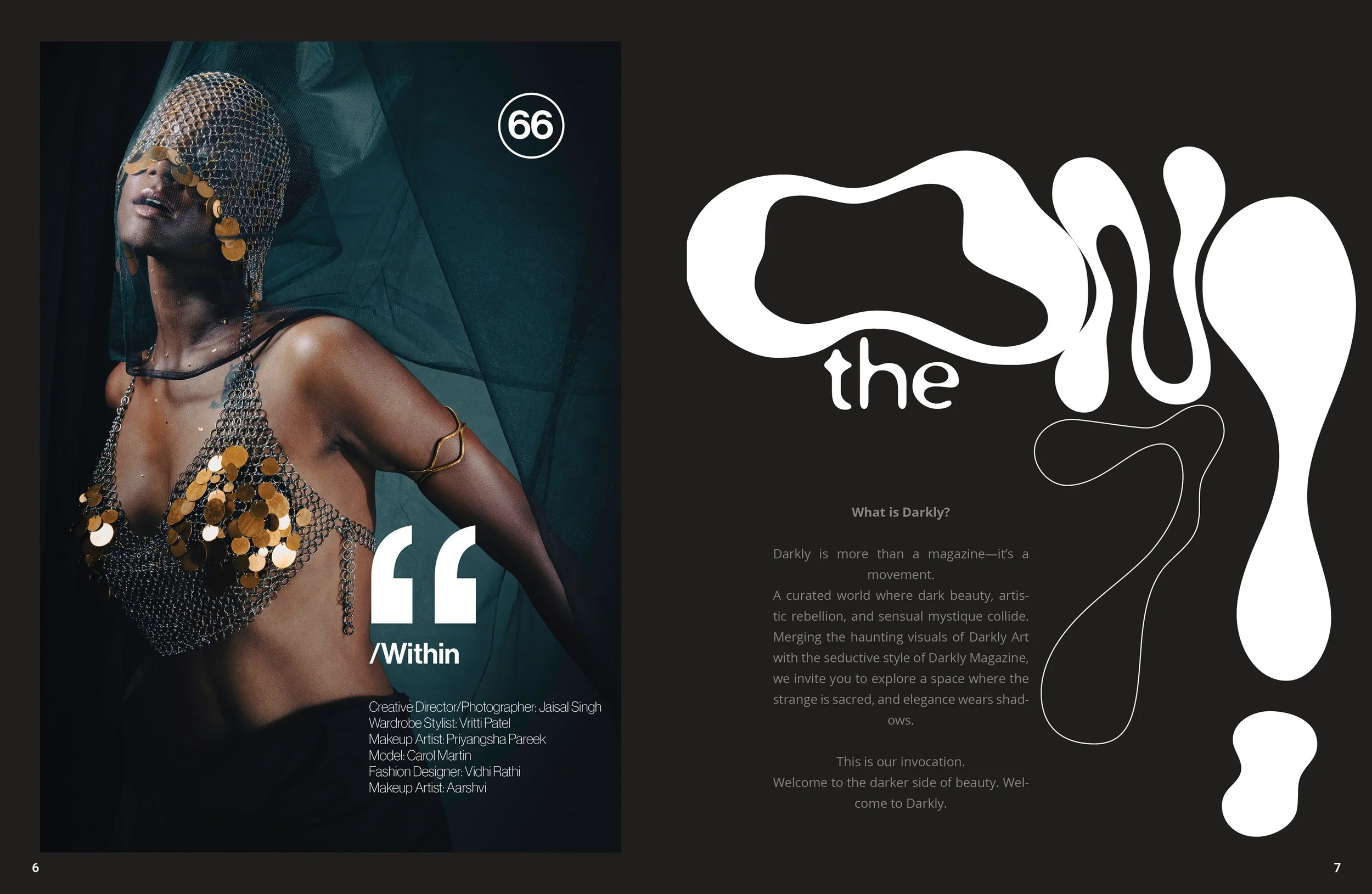 A magazine spread featuring a woman dressed in dark, artistic attire with gold and silver jewelry, and a headdress with coins and chains, on the left. On the right, abstract black and white graphics with the words 'the' and a paragraph describing the